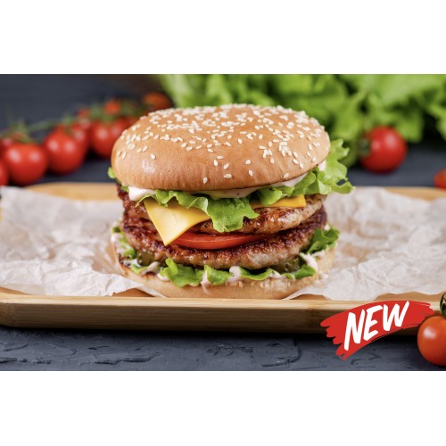 котлета 2шт, соус бургер, огурец солёный, латук, помидор, сыр чеддер ..
