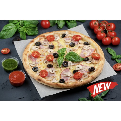 ветчина, куриное филе, шампиньоны свежие, сыр Моцарелла, помидоры черри, маслины, соус..