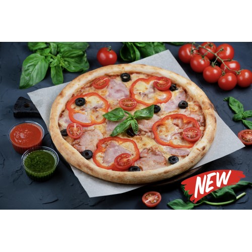 бекон копченный, ветчина, болгарский перец, маслины, сыр Моцарелла, помидор черри, соу..