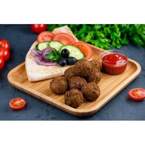 Лаваш арабский, фалафель (200гр), огурец свежий, помидор, лук свежий, маслины, соус кетчуп ..