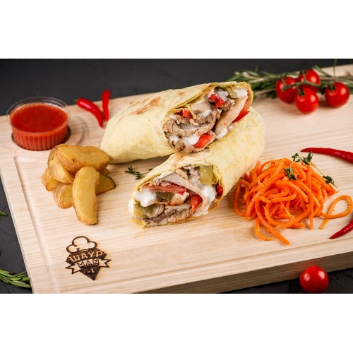 мясо куриное (130г), огурец соленый, картофель, морковь по-корейски, зелень, соус чесночный, гр..