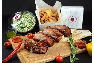 Ребра (1000гр) подаются с соленьями (квашенная капуста, соленый огурец, кислый по..