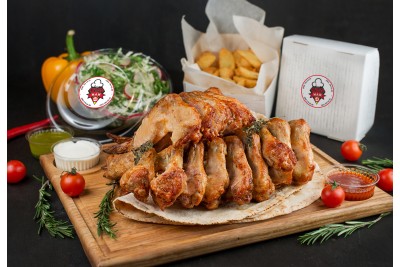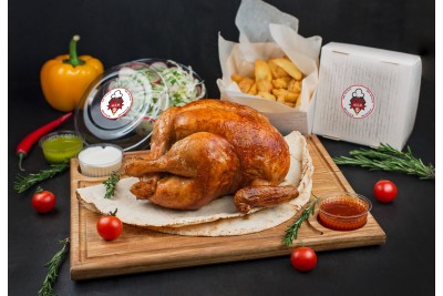 Курица (1100-1200гр) подаётся с соленьями (квашенная капуста, соленый огурец, кислый ..