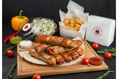 Колбаски 8шт (950-1000гр) подаются с соленьями (квашенная капуста, соленый огурец, кис..