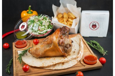 Рулька (800-1000гр) подаётся с соленьями (квашенная капуста, соленый огурец, кис..